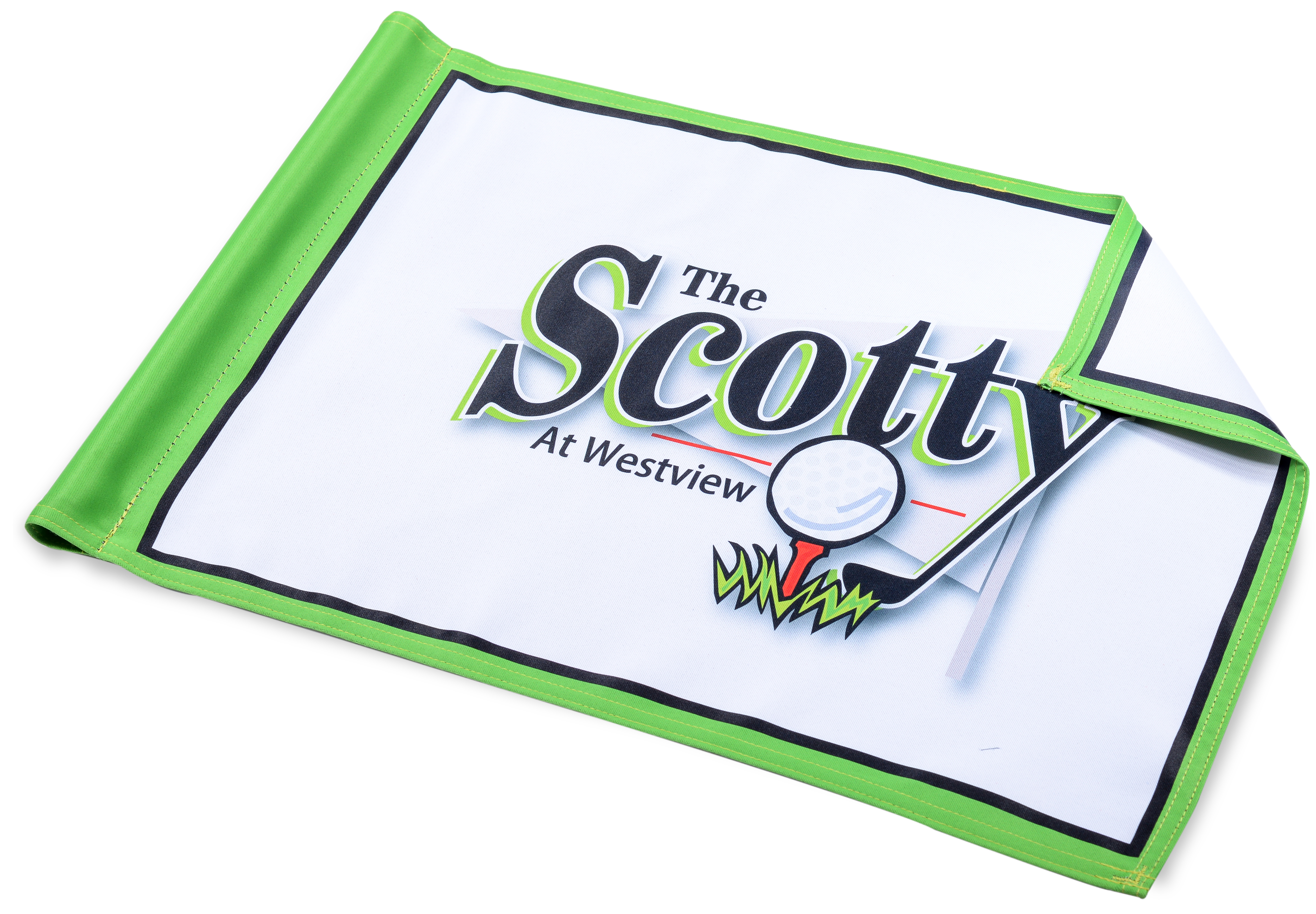 One-sided or Two-sided Dye-sublimated golf flags with UV resistant ink. Minimum Quantity 9.
